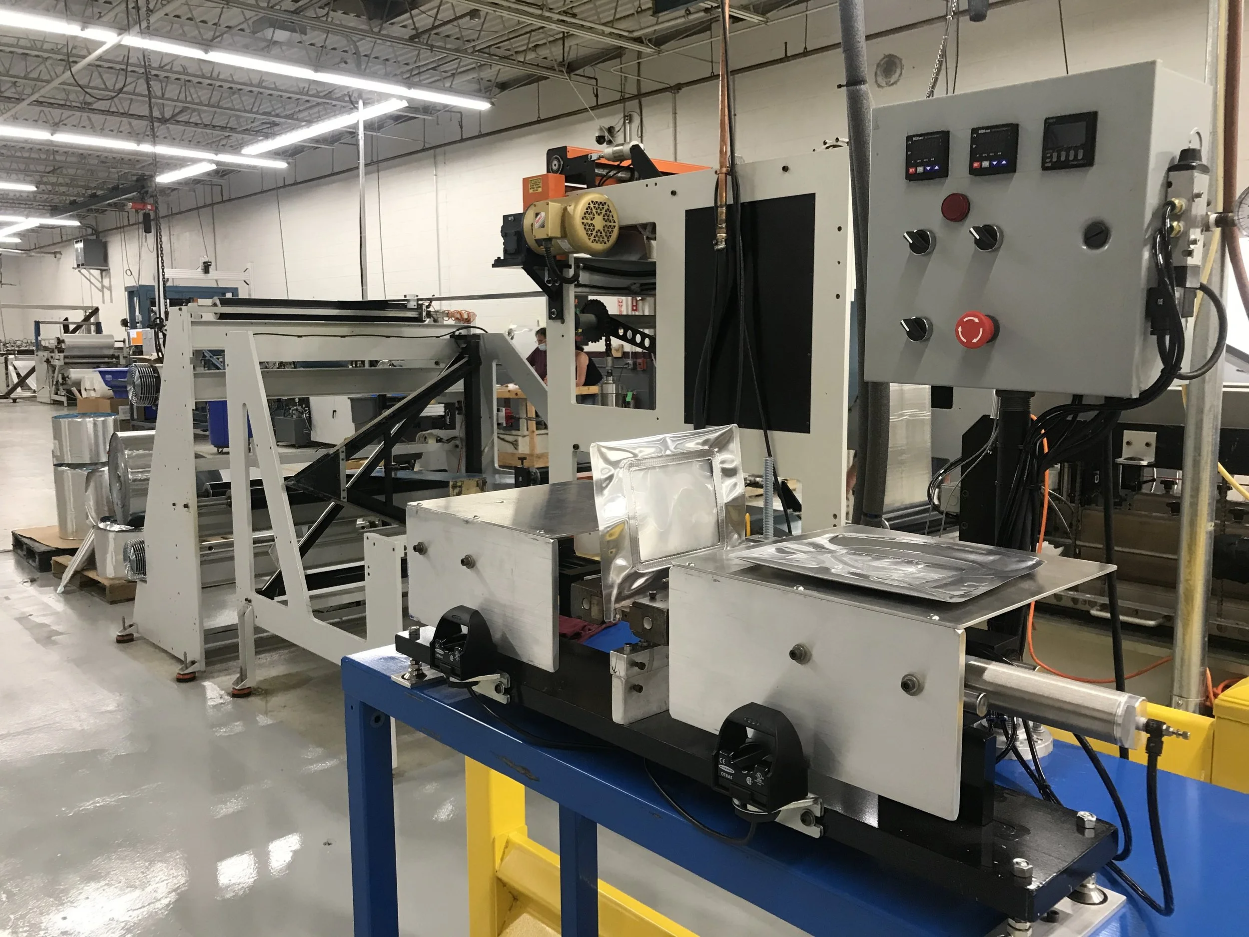 Photo of our fitment installation heat sealer, which allows us to precisely regulate time, temperature, and pressure.