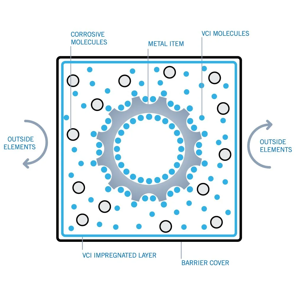 VCI molecules are Volatile Corrosion Inhibitors. They are attracted to clean, bare metal, and exchange electrons with metallic molecules when they meet. This exchange creates a thin protective coating on the metal (like a forcefield or an invisible blanket), deflecting other corrosive molecules and guarding your equipment.